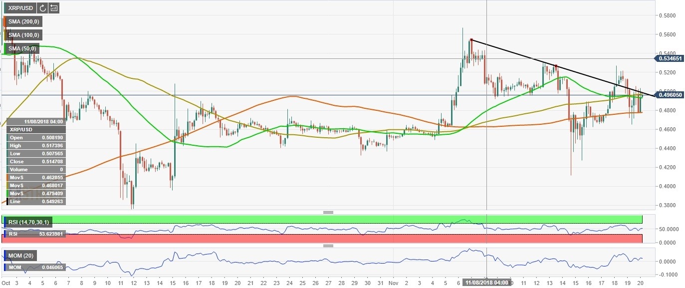 XRP/USD is the best from the worst with just 1% of losses in recent 24 hours. This result looks like a resounding victory as Ripple peers are down from 7% to 40%. Currently, XRP/USD is changing hands at $0.4939, off the recent low reached at $0.4115 on November 14. XRP takes the second place in cryptocurrency rating with a market value over $19.8B and an average daily trading volume over $1.3B.