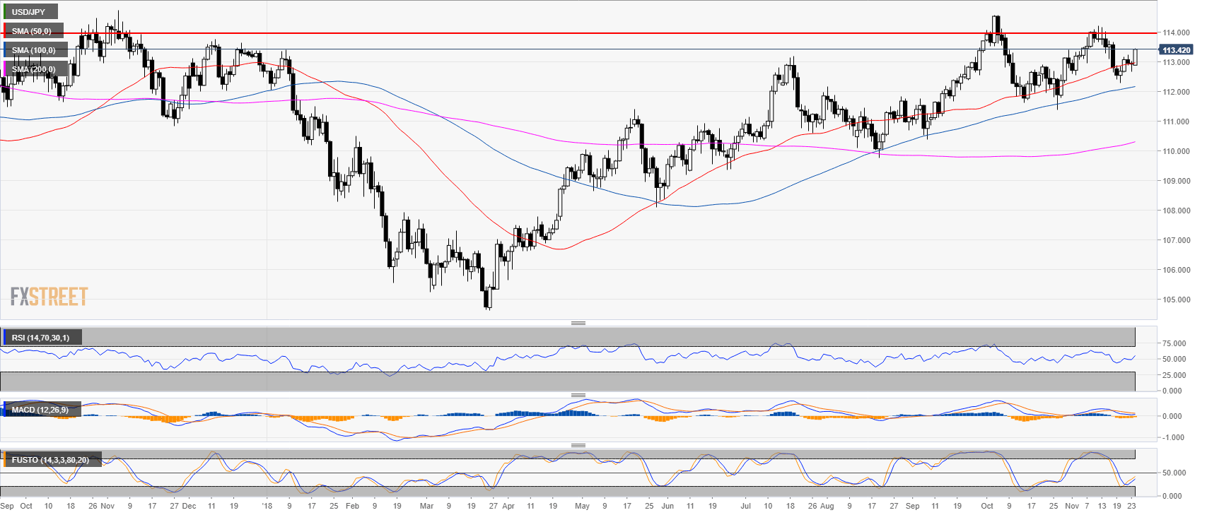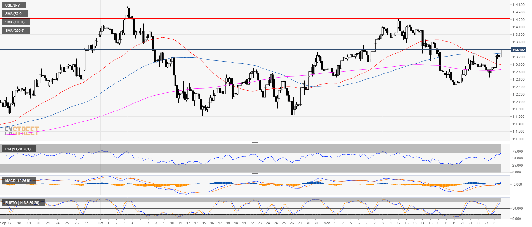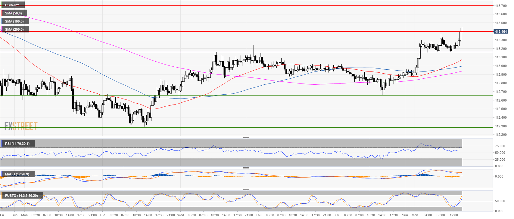 - USD/JPY broke above 113.20 and the last swing high as the market is trading above its main SMAs.