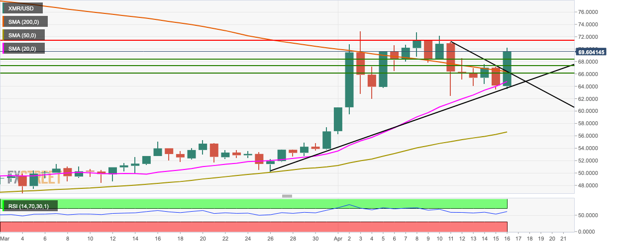- XMR/USD went up from $64 to $69.70 as bulls look to test the $70 barrier.