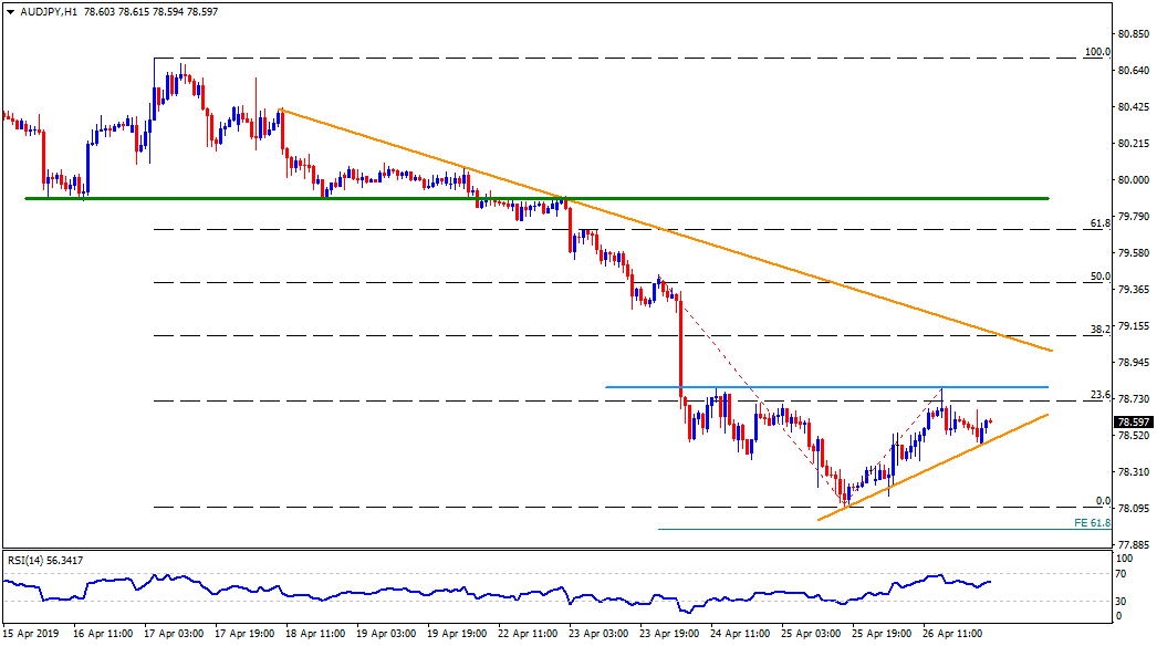 Despite recovering since the middle of the last week, the AUD/JPY pair is still to conquer 78.80 horizontal-line as it trades near 78.60 during early Monday.