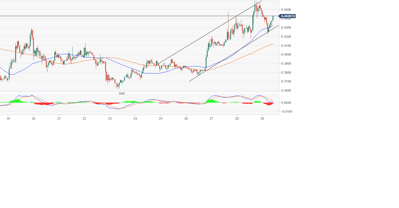 Short-Term support has been established at $0.4200. At the same time, the ascending channel lower trendline continues to prevent dips due to the rising volatility on the market. While supported by the 50 Simple Moving Average(SMA) 1-hour, the price has increased in value to exchange hands at $0.442.