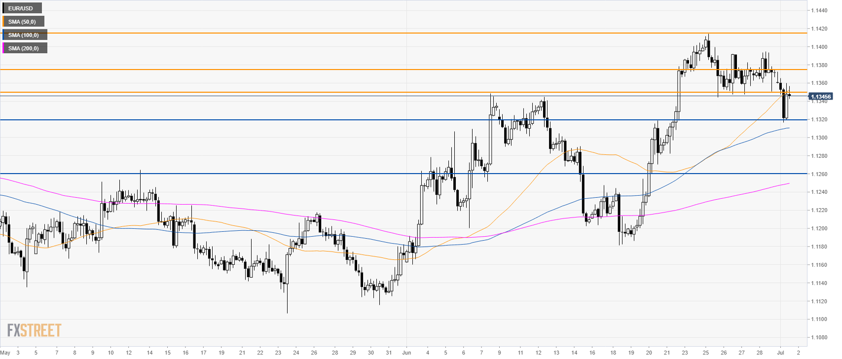 EUR/USD is sliding from recent tops made near the 1.1400 figure. The market is challenging the 200 daily simple moving average (DSMA).