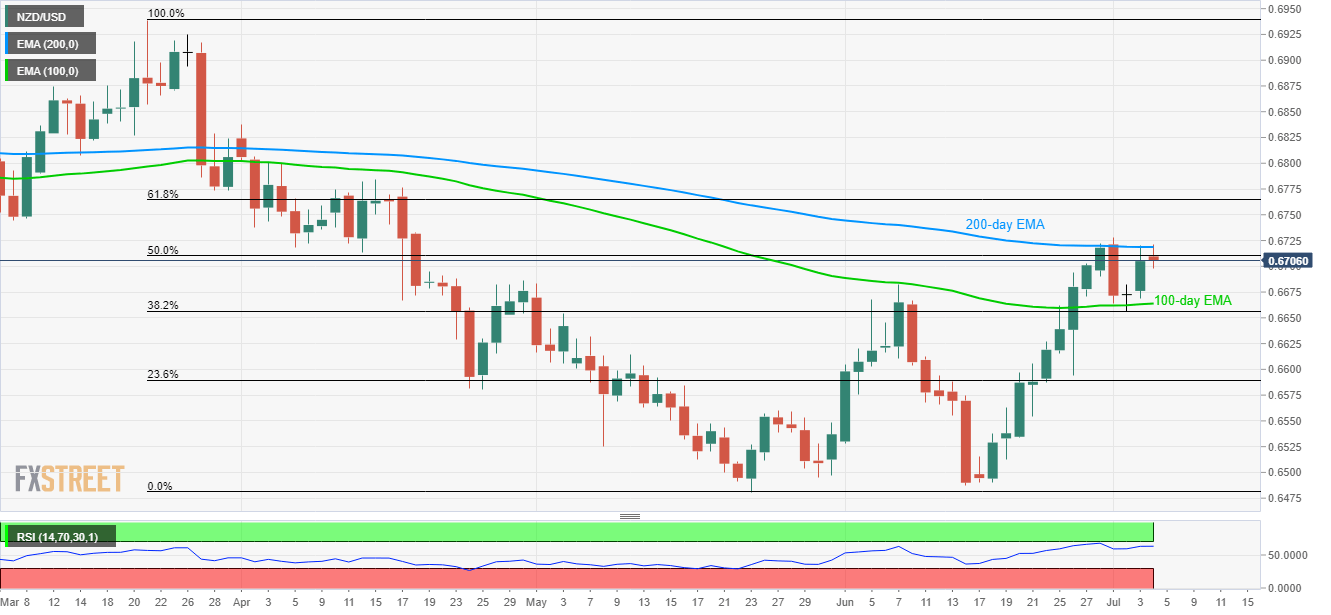 Having reversed from 38.2% Fibonacci retracement of its March-May decline, the NZD/USD pair again challenges the 200-day exponential moving average (EMA) while trading near 0.6707 during early Thursday.