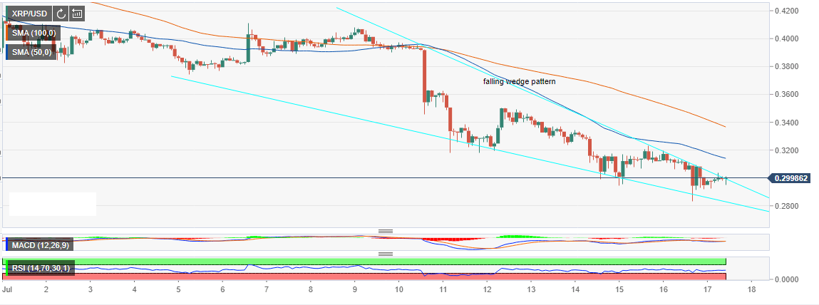 Meanwhile, XRP has recovered stepping above $0.3 as the bull’s push towards the falling wedge pattern breakout. Although movement north is still hampered by the selling pressure, XRP/USD has a positive technical picture as seen on the 2-h chart.