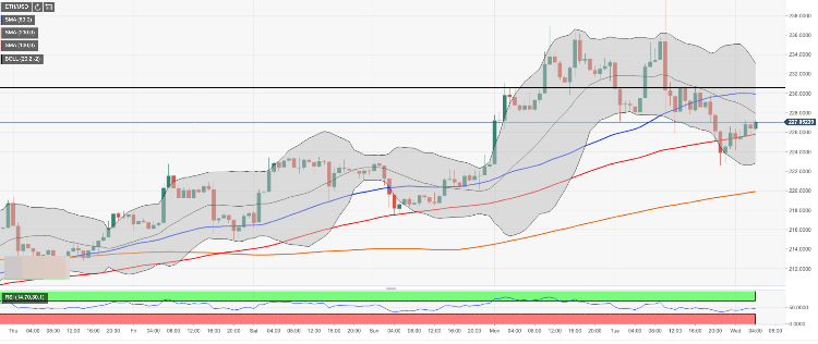 Ethereum, the second-largest cryptocurrency with the current market capitalization of $24.3 billion, has settled at $226.50 after an unsuccessful attempt to break $240.00 barrier. The coin touched $239.56 high on Tuesday, but failed to hold the ground and retreated to $222.00 low. The coin has lost over 1.5% in recent 24 hours and stayed range-bound since the beginning of the day.