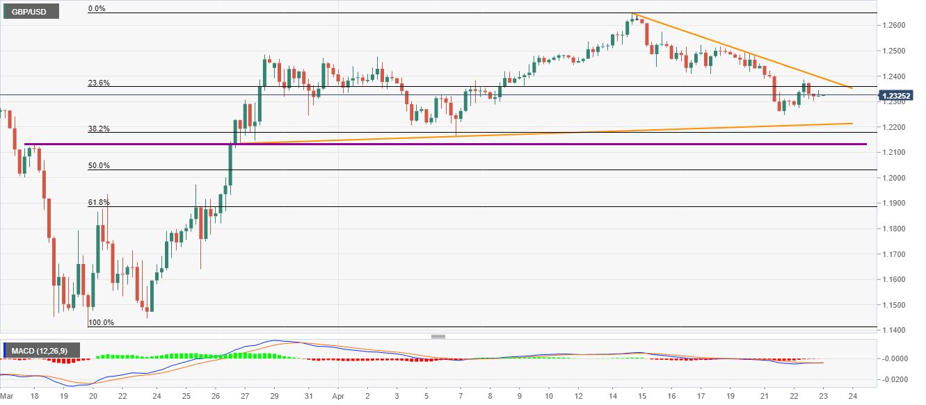 GBP/USD drops 0.10% on a day, to currently near 1.2320, amid the early Asian session on Thursday. In doing so, the pair fails to extend the previous day’s recovery moves as portrayed by a seven-day-old falling trendline.