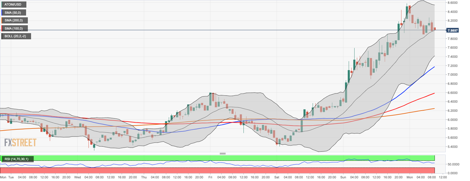 ATOM retreated from the recent high to test the local support created by the middle line of the 1-hour Bollinger Band located marginally below $8.00. As the FXStreet has already reported, this support is critical for the coin in the short run. Once this barrier gives way, the sell-off may be extended towards $7.00 (1-hour SMA50) and $6.50 (1-hour SMA100). The further decline looks unlikely at this stage as the RSI on the intraday charts stays on the neutral territory and still points upwards.