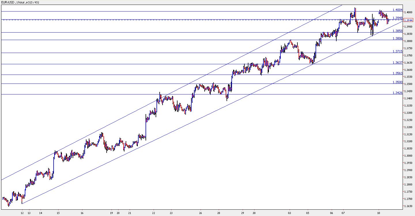 EUR/USD started the week by consolidating under 1.40, drifting again towards uptrend support. Will it dip under the line on this quiet day? Here’s a quick update on technicals, fundamentals and community trends.