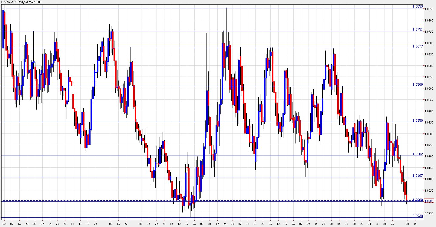USD/CAD has been falling gradually throughout most of the week. A jump above 1.01 (mentioned last week) was temporary, and USD/CAD parity was reached at the end of the week, with the close just above this level – 1.0004.
