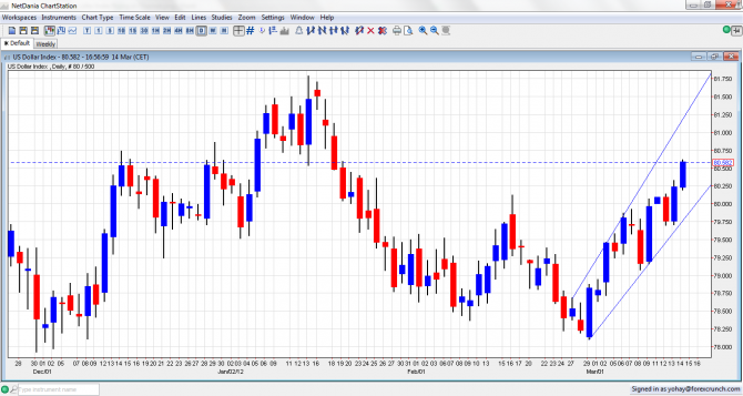The US Dollar Index is around 80.58, rising strongly in the past few days, and continuing the move in the uptrend channel: