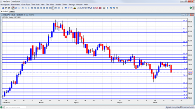 Updates: The BOJ Monthly Report was released on Monday. The report was upbeat about Japan’s export market, but noted that slower slowing growth in China and the severe debt crisis in the Euro-zone could hurt the fragile Japanese economy. Trade Balance will be released on Tuesday. USD/JPY continues to be choppy, as the pair was trading at 78.90. The BOJ released its Monetary Policy Meeting Minutes on Tuesday. Trade Balance plunged, posting a deficit of 66 trillion. It was the largest monthly deficit in over four years. All Industries Activities came in at 0.1%, a notch below the market estimate of 0.2%. BOJ Governor Shirakawa delivered a speech at a bank conference in Tokyo. USD/JPY weakened slightly as the BOJ stated that it was prepared to take bold action to support the economy if necessary. This raises the possibility that the central bank is considering monetary easing measures in July. USD/JPY was trading just below the 80 line, at 0.7995.