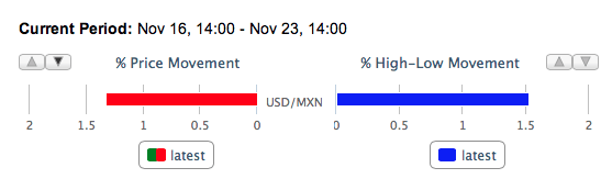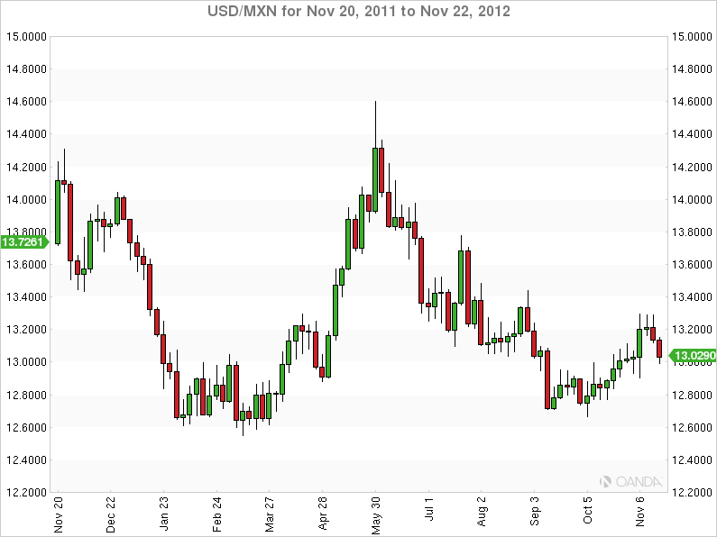 The USD/MXN has lived through a number of ups and downs since the summer. It was one of the hardest hit currency pairs in the wake of the European crisis. The OANDA volatility tool shows a close to 1.21% appreciation of the MXN versus the USD. This movement came with strong momentum, as overall high-low movement was around 2.11%. Weekly high was 13.2832 while the low was 13.0086.