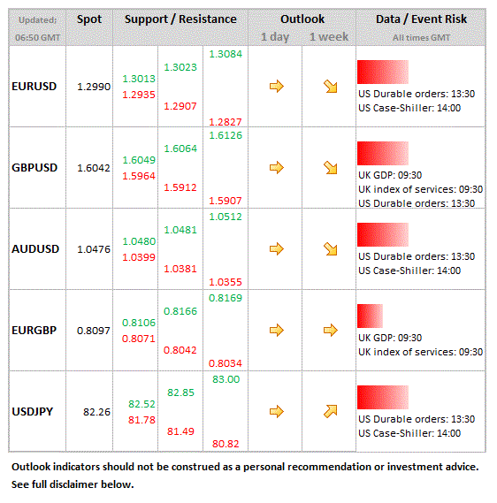 - USD: Lots of potential event risk today, with numerous releases later, including durable goods orders, Case-Shiller house prices and consumer confidence. Dollar has lost some impetus in recent days – month-end flows may provide some brief respite.