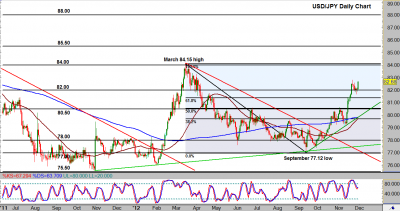 USD/JPY (daily chart) has made a sharp rise after retracing over the past week to just below the key 82.00 support level. This occurs after strong bullish momentum accelerated the new bullish trend that began around the September 77.12 low, advancing price above the key 80.50 prior resistance level by mid-November. After reaching heights just below 83.00 last week, the minor pullback occurred before today’s upside advance. With the strong uptrend in place, bullish price action could be biased towards a re-test of key prior resistance around the 84.00 level, last reached and respected in March. Any significant breakout above that level could move towards further potential resistance around the 85.50 price region.