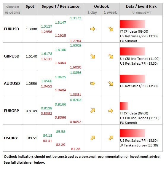 - EUR: Leaders gather today for two-day summit, but expectations have been managed downwards ahead of the event and agreement on banking supervision by finance ministers last night may be held up as the main big win of the week, reducing pressure on heads of state to come up with something to appease markets.