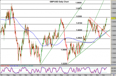 GBP/USD (daily chart) has tentatively paused its climb around a rough triple top resistance area in the 1.6300 price region. The first top of the triple top was established in April, then re-tested and respected in September, and finally re-tested and respected again yesterday with a minor shooting star candle retreat. Since yesterday, price has regained some of that retreat, with price once again rising to approach the 1.6300 level. This occurs within the context of a strong overall bullish trend extending back to the June 1.5266 low. It also occurs in the midst of a steep uptrend that has been in place for the past two weeks. If the pair is able to further this bullish trend with a significant breakout above 1.6300, which would confirm a bullish trend continuation, price could move towards further potential resistance around the 1.6475-1.6500 price region. If price once again respects the 1.6300 level with a retreat to the downside, key potential support on a bearish correction could reside around the important 1.6150 price region.