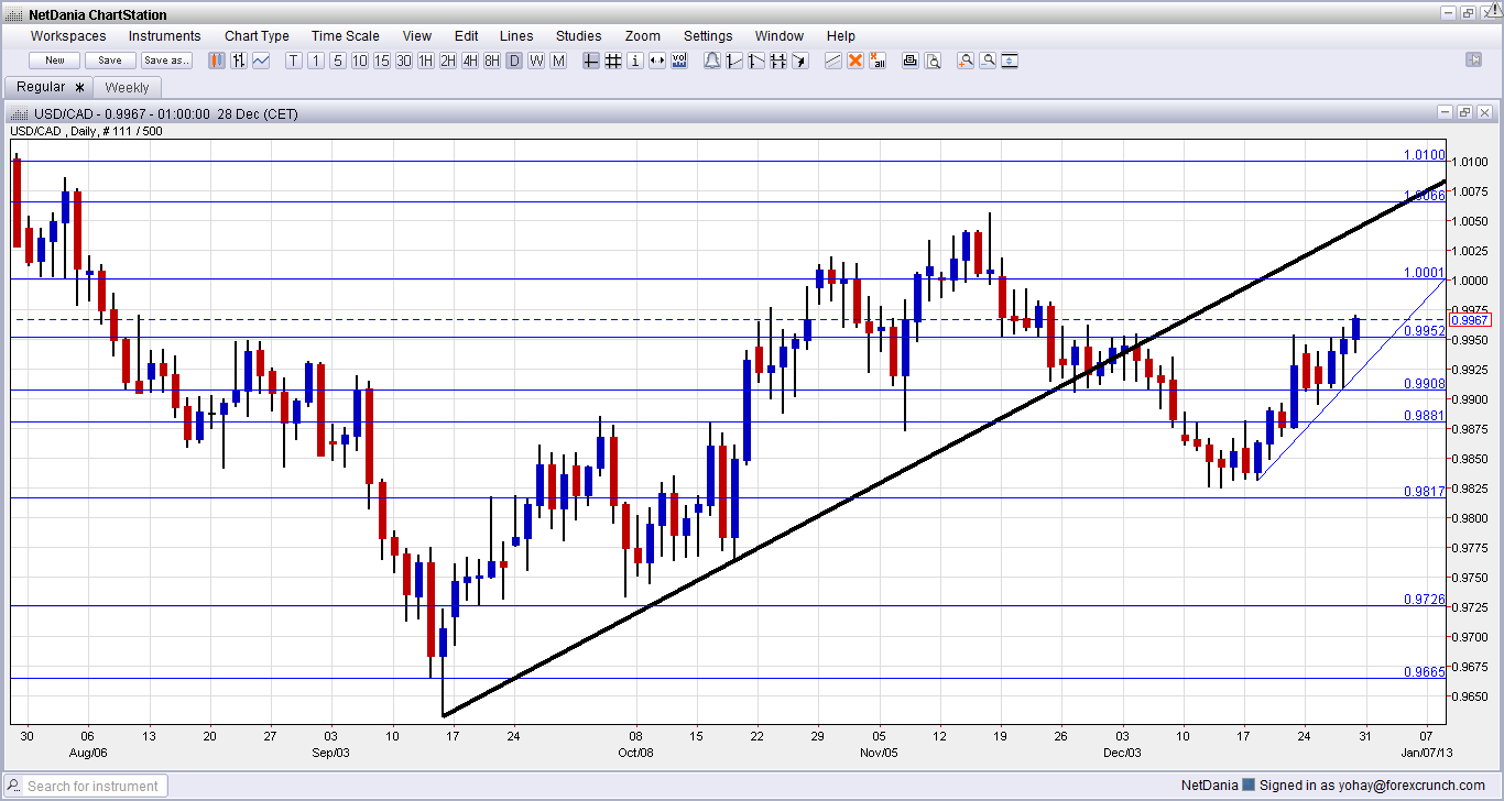 USD/CAD rose for another week, and is now within reach of parity. As 2013 enters, important indicators are released. Employment data is the major event this week. Here is an outlook on the major market-movers and an updated technical analysis for USD/CAD.