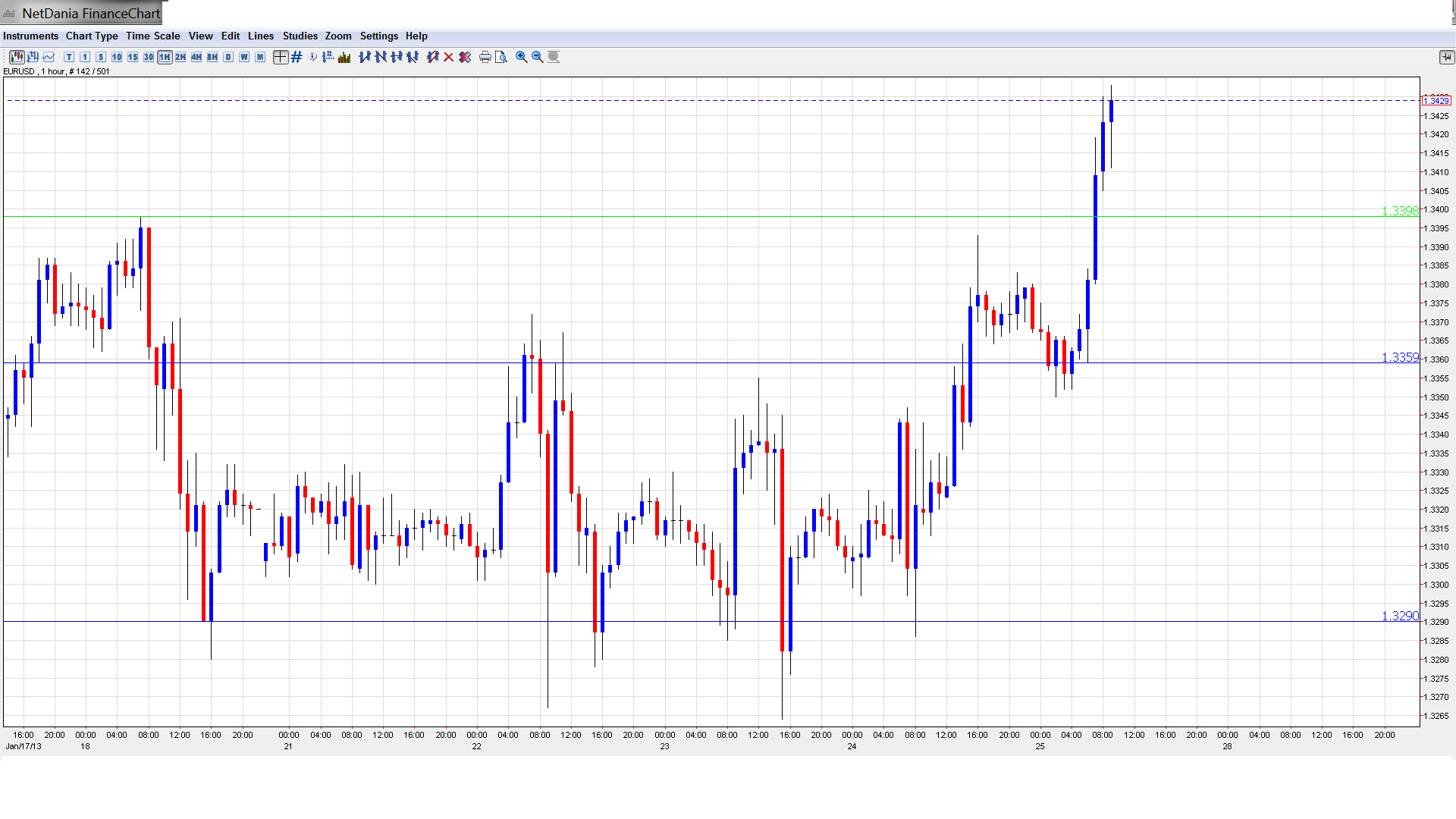 - Asian session: Euro/dollar gained ground, breaking above 1.34 and climbing to 1.3419. The pair consolidated at 1.3413. Euro/dollar is unchanged in the European session.