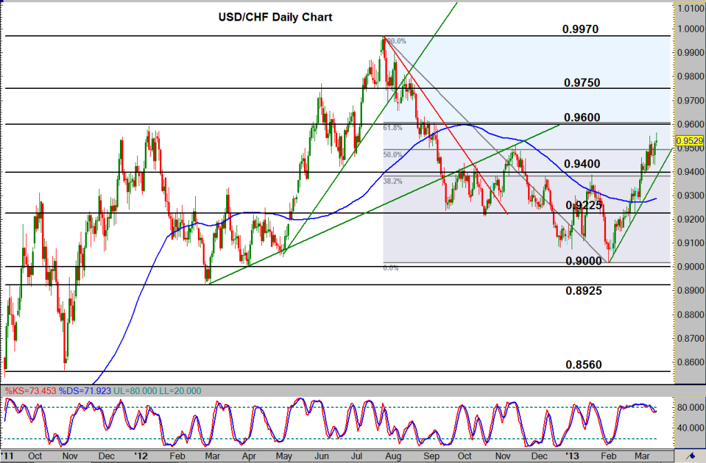 USD/CHF (daily chart) as of March 14, 2013 has advanced the steep uptrend that began in February by establishing a high at 0.9565 in early trading this morning, reaching a new half-year high. The bullish trend began more than a month ago from the low around the key 0.9000 support area, and has followed a steeply-angled trend line to the upside without any major bearish retracements thus far.