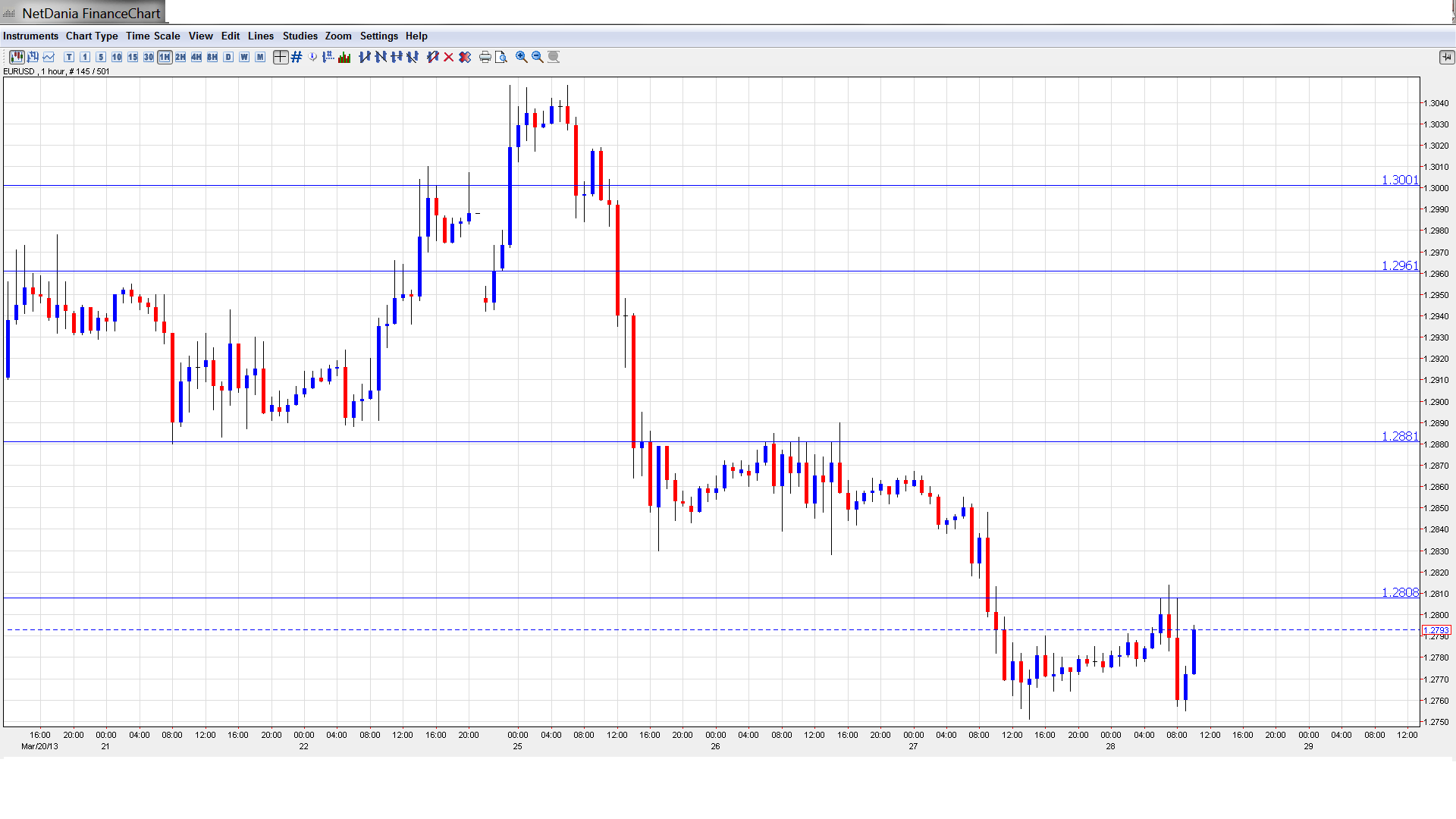 - Markets Nervously Monitor Cyprus: Despite the fact that a deal regarding Cyprus was announced on Monday, the lack of details and implications has left the markets jittery. The deal has not brought calm to the small Eurozone member, which has been at the center of a financial crisis over a EUR10 billion bailout. The country’s banks are to reopen on Thursday, after being tightly shut for almost two weeks. Fearing a bank run, the government has imposed strict controls, including limiting withdrawals to 300 euros a day, and a ban on cashing checks. The size of the haircut imposed on accounts of over 100,000 euros is still unknown, and there are rumors that large depositors could lose up to 40% of their savings. The euro has taken it on the chin this week, dropping over two cents against the dollar.