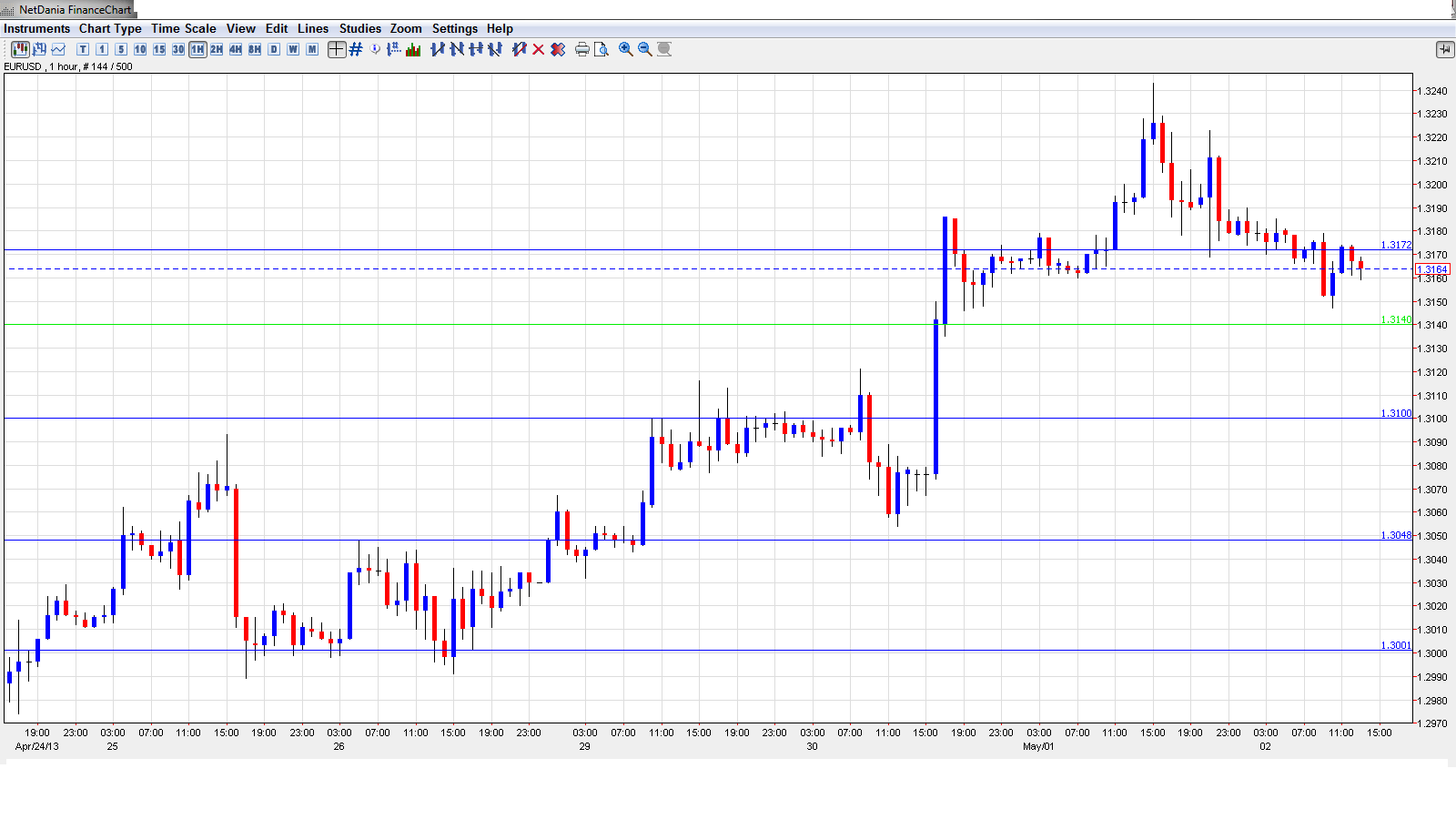 EUR/USD is very quiet in Thursday trading, as the markets eagerly await the ECB rate announcement. The pair was trading in the 1.3170 range in the European session. With the markets expecting a cut to a record low level of 0.50%, we could see some volatility from the euro following the rate decision. In the US, the Federal Reserve statement was a non-event, as the Fed had little to say and took no new action. In economic news, Spanish Manufacturing PMI came in as expected, while Italian Manufacturing PMI beat the forecast. Today’s highlight out of the US are Trade Balance and the weekly Unemployment Claims.