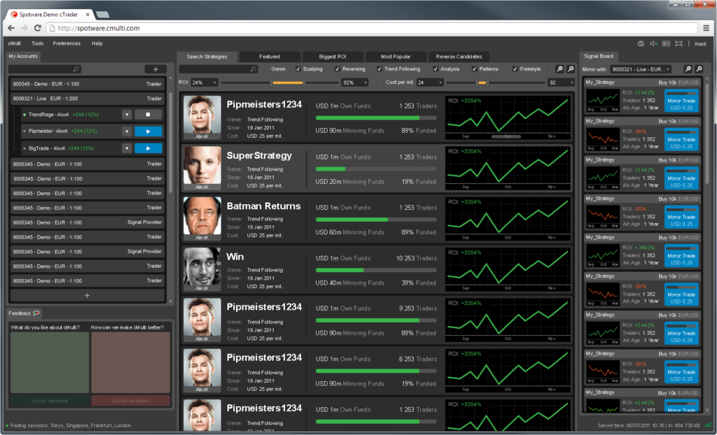 Alex Katsaros, Project Manager at Spotware, says “In working to create cMulti, we focused independently on three main client groups: Traders or ‘followers’, signal providers and brokers.”