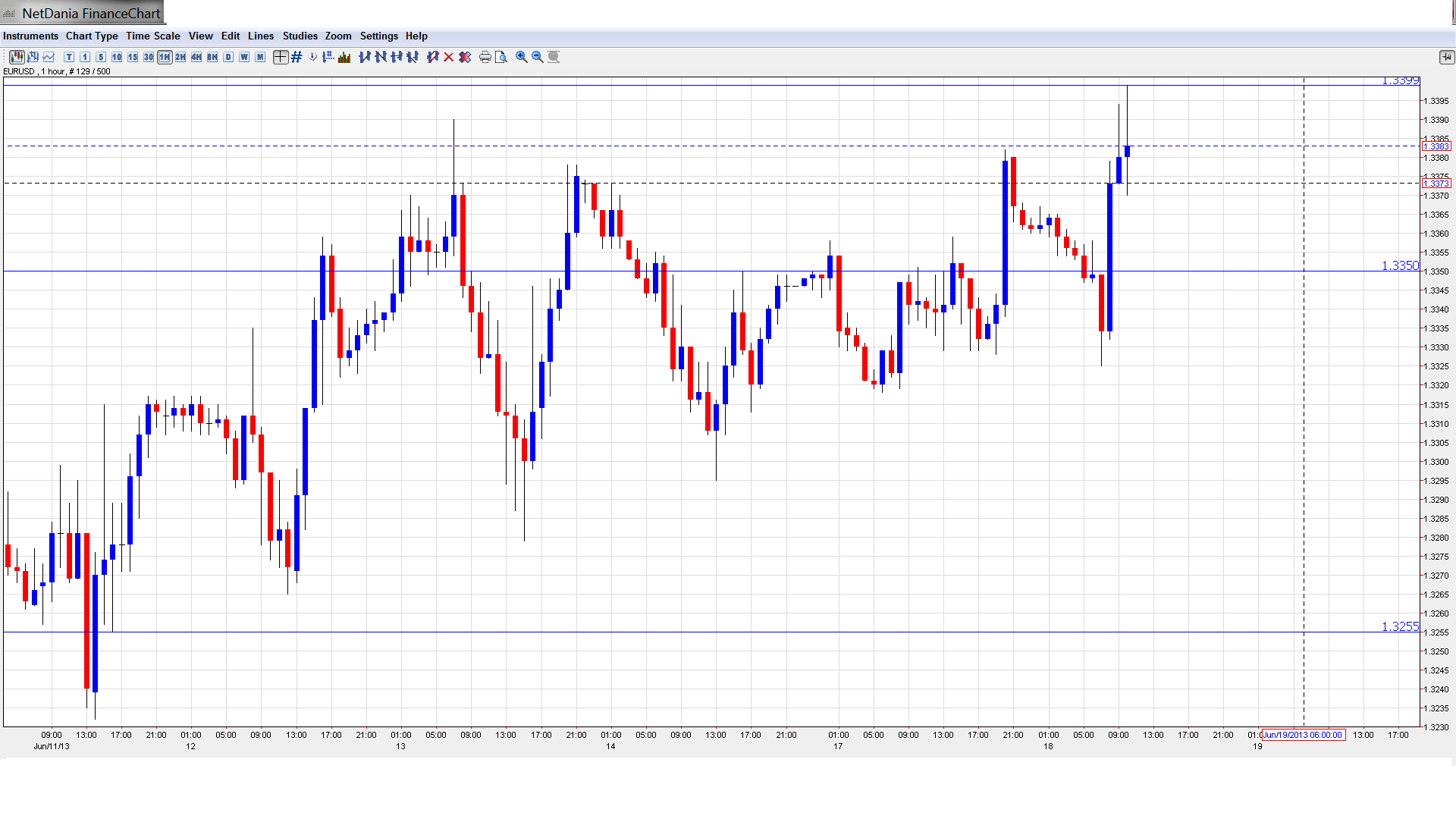 EUR/USD has edged higher in Tuesday trading, as the pair trades in the high-1.33 range. After a slow day on Monday, the markets will be busy, with key releases from the Eurozone and the US. In the Eurozone, German ZEW Economic Sentiment was very close to the estimate, while Eurozone ZEW Economic Sentiment beat its forecast. Later on, the US releases two key events – Building Permits and Core CPI. The week started on the right note for the US, as the Empire State Manufacturing Index was very sharp. The G8, which is meeting in Northern Ireland, has launched talks for a EU – US free trade pact.