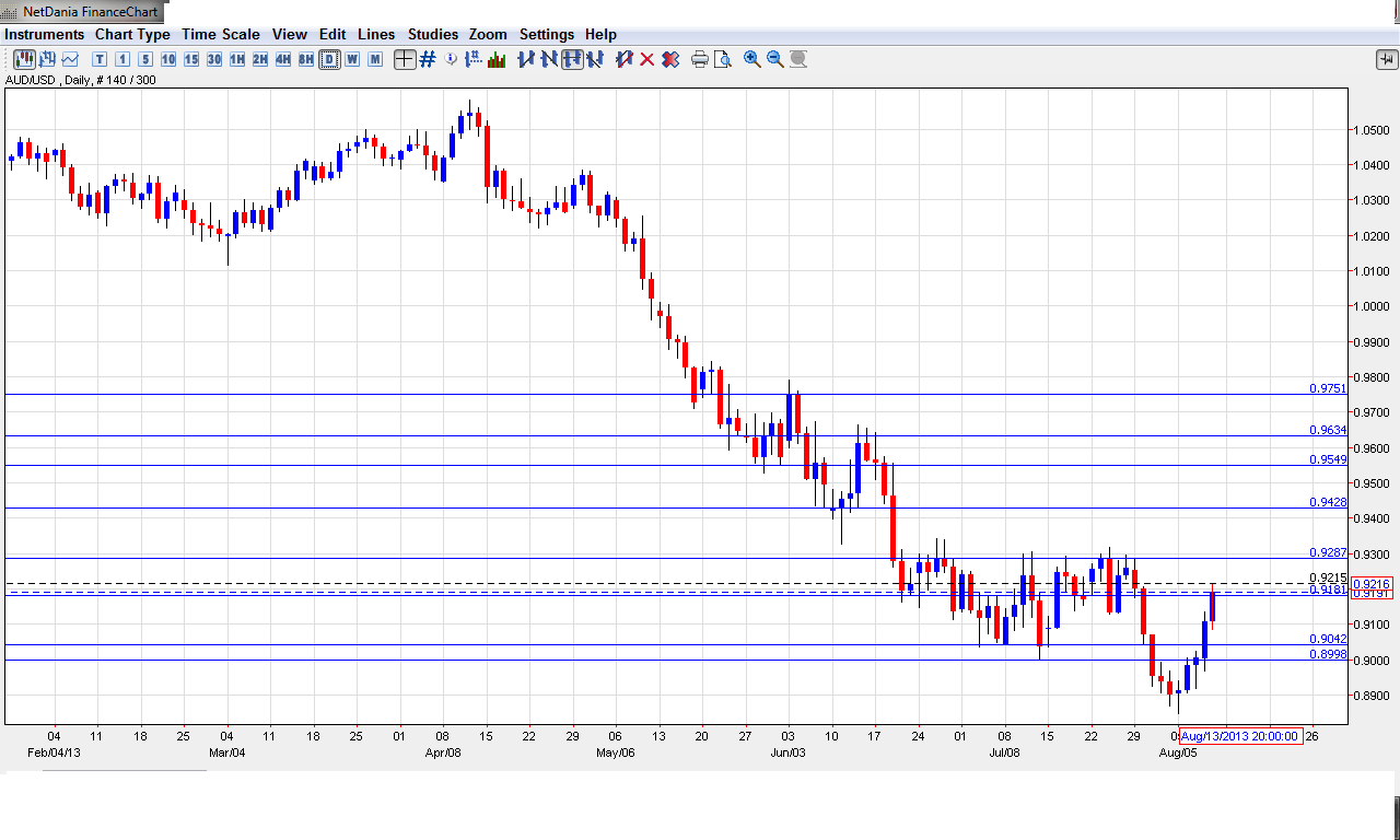 AUD/USD  continues to receive support at 0.9180. This line began the week in a resistance role, but could not hold in the face of an impressive rally by the Australian dollar.