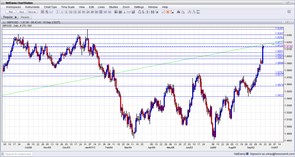 The decision of the Fed to NOT taper bond buys found many surprised, but the British pound was already well prepared for the next move. With strong economic indicators showing strength in the UK economy and stops waiting above 1.60, GBP/USD shot up around 300 pips and is now trading at levels last seen in January.