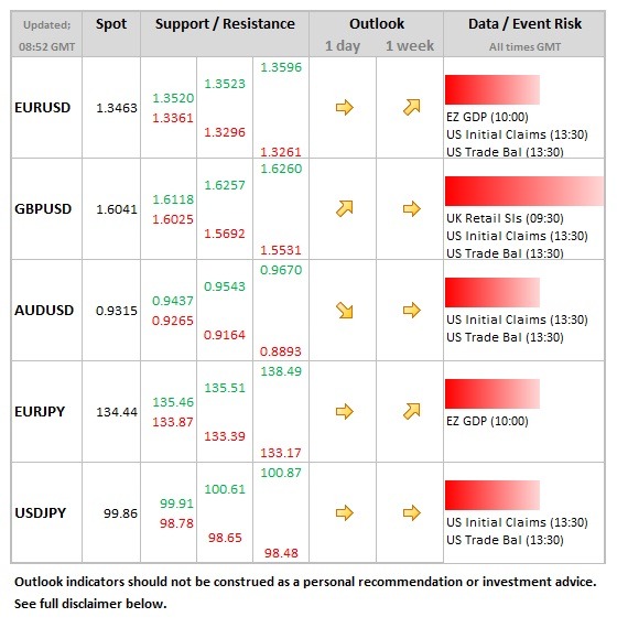 EUR: Initial expectations were for eurozone GDP to expand by 0.1% QoQ, but after slightly weaker than expected numbers from France this morning, this could turn out flat. The single currency would be more vulnerable to a negative reading, give the risk of the eurozone moving back into recession.