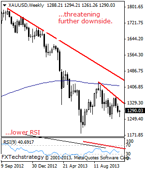 GOLD: Though closing flat the past week, its broader medium term downtrend remains intact. Below its declining trendline leaves our bias to the downside with eyes on the 1,251.56 level. A breach will aim at the 1,215.00 level.
