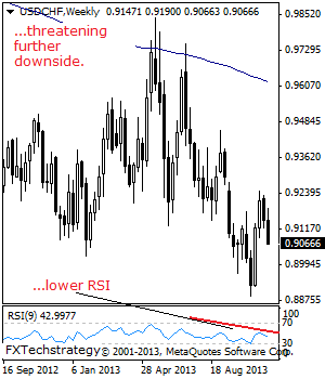 USD/CHF: With a second week of decline occurring the past week, there is risk of a return to the 0.9000 level. A violation of here will turn attention to its Oct 2013 low at the 0.8889 level.