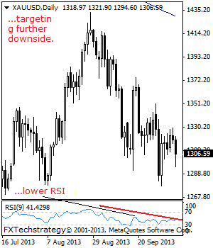 A violation of this level will aim at the 1,250.00 level with a turn below here shifting attention to the 1,215.00 level and next the 1,180.00 level. Its daily RSI is bearish and pointing lower suggesting further downside.