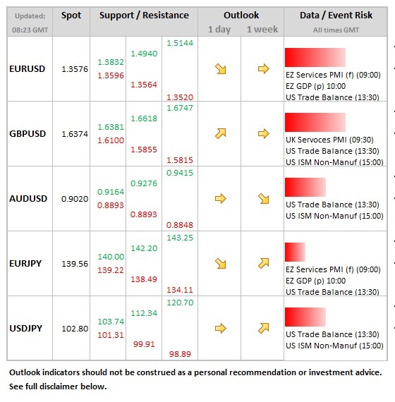 GBP: Both the manufacturing and construction PMI have come in better than expected this week, so expectations are for the services series to do the same, even though the official market expectation is for a move lower, from 62.5 to 62.0. Sterling would react positively to a number 62.5 or higher, but gains could struggle to be sustained, especially above the 1.64 level on cable.