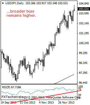 USD/JPY: The pair remains on its medium term offensive as it looks to extend that gain. Resistance resides at the 103.91 level where a violation will aim the 104.50 level. Above here will resume its broader upside towards the 105.00 level.
