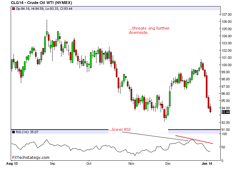 CRUDE OIL: The commodity continues to sell off declining further today on the back of the past week losses. This development has exposed its immediate support located at the 93.00 level where a violation will turn focus to the 92.10 level, its Dec 27’2013 low.