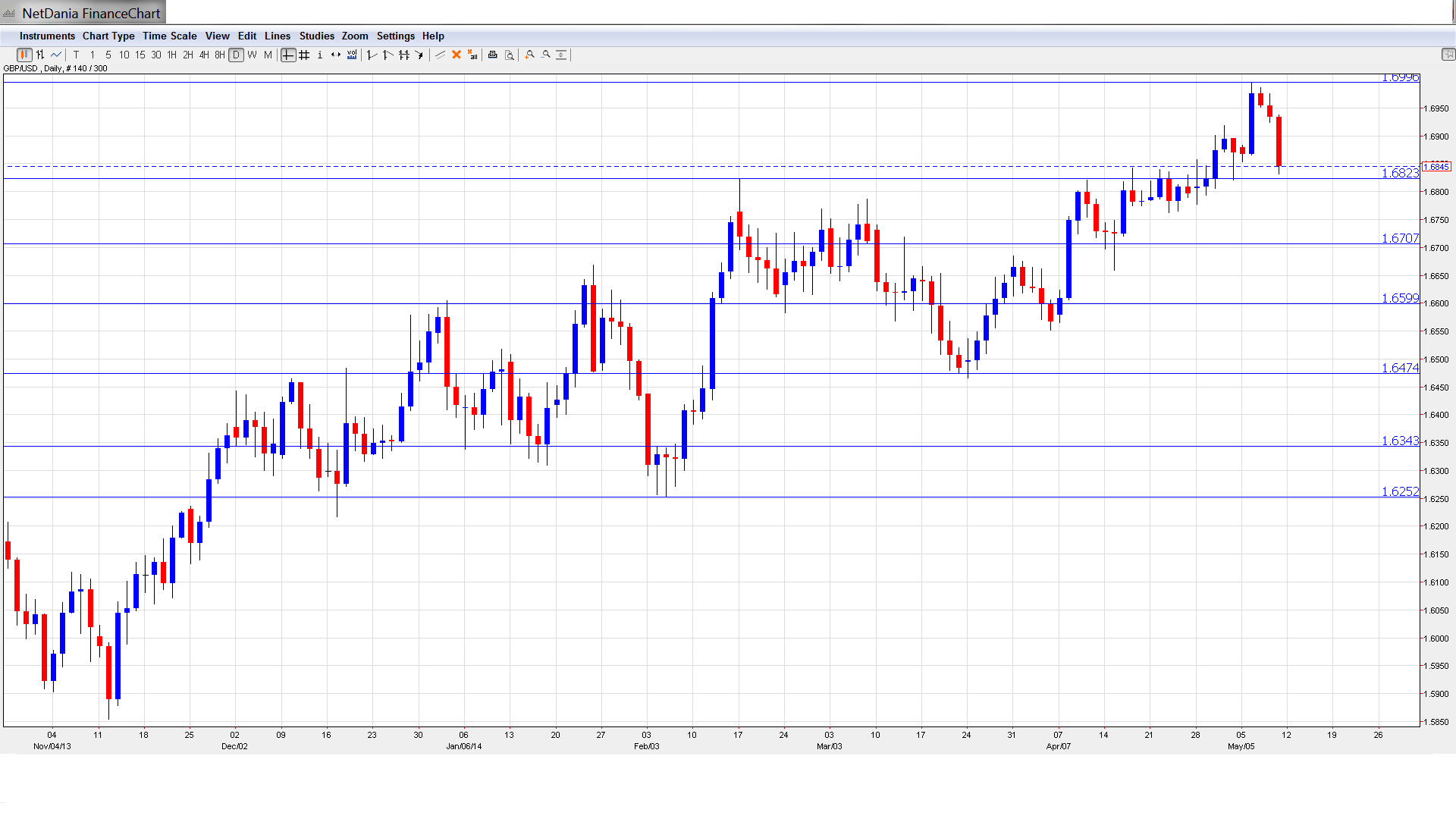 GBP/USD opened the week at 1.6879.  The pair climbed to a high of 1.6996.  GBP/USD then reversed directions and dropped to a low of 1.6832, as support held at 1.6823 (discussed last week). The pair closed the week at 1.6845.