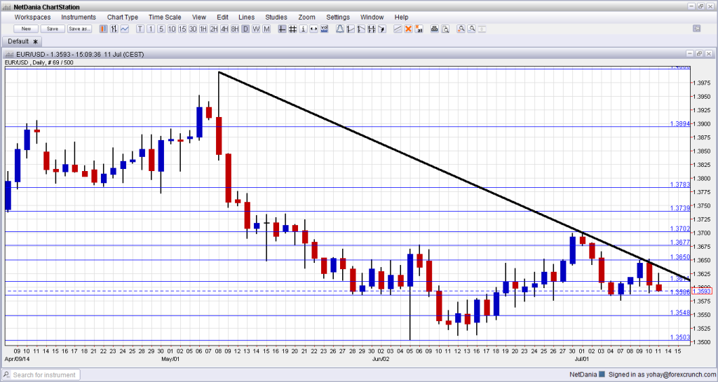 A shareholder in a major Portuguese bank missed a debt payment and the fear that gripped the markets already triggered a delay of some bond auctions in neighboring Spain. While the situation seems contained, we were reminded that the debt crisis is not fully resolved. Also the weak industrial output data weighed on the euro. In the US, we received more good news from labor market indicators, yet markets are still uncertain about the timing of the US rate hike, and that was not helpful to the greenback. The odds seem stacked against the pair, but the range is well maintained. Will we see a breakout now?