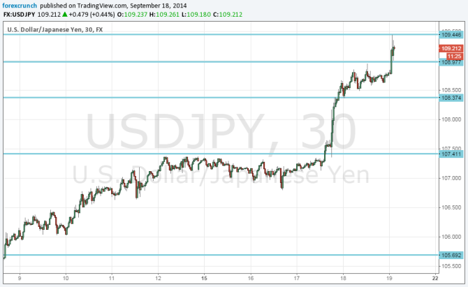 USD/JPY continues looking unstoppable, and it now it took another round number: 109. The pair consolidated its gains that followed the FOMC dollar rally and stayed under 109 for some time.