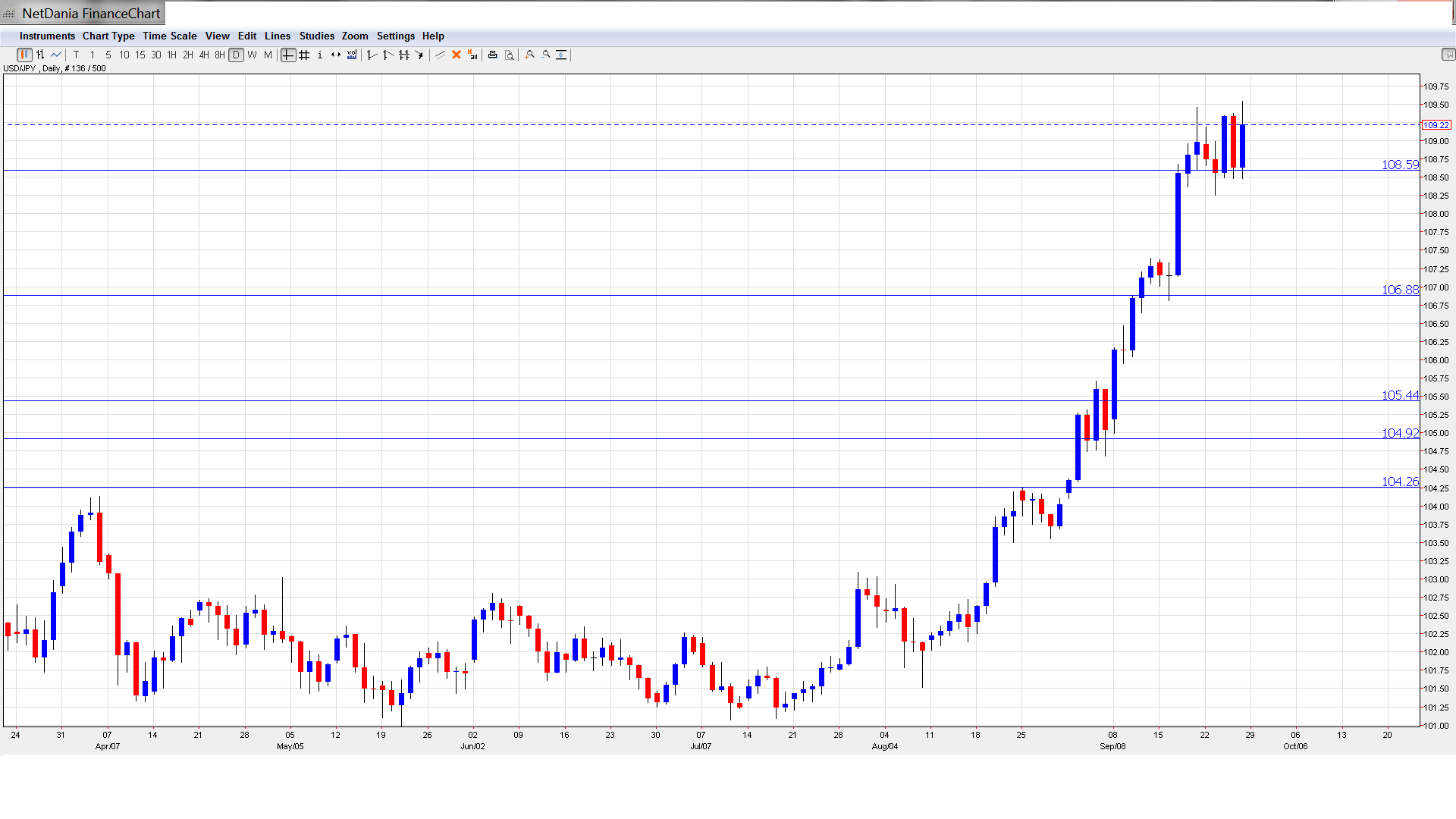 110.68 represented a high point of a strong dollar rally in August 2008, which started around the key 100 level.