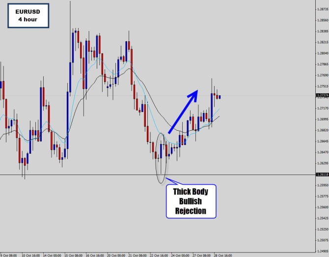 The EURUSD 4 hour chart produced a large ‘thick bodied’ bullish rejection candle / pin bar reversal, signalling that higher prices are likely to develop. I always try to line up 4 hour setups off important daily levels to help increase the probabilities of the trade working out. A retracement entry has already been offered on this setup, let’s see how this one plays out to finished off this week’s trading.