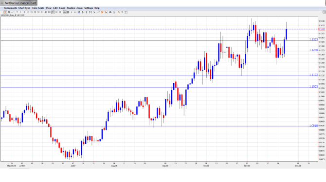 Canadian retail sales numbers improved in September and GDP improved with a gain of 0.4%. Still, the positive numbers were not enough to stop the Canadian dollar’s sharp slide. The large batch of US data before Thanksgiving was largely disappointing: durable goods orders were mixed, unemployment claims missed the estimate, and housing numbers softened.