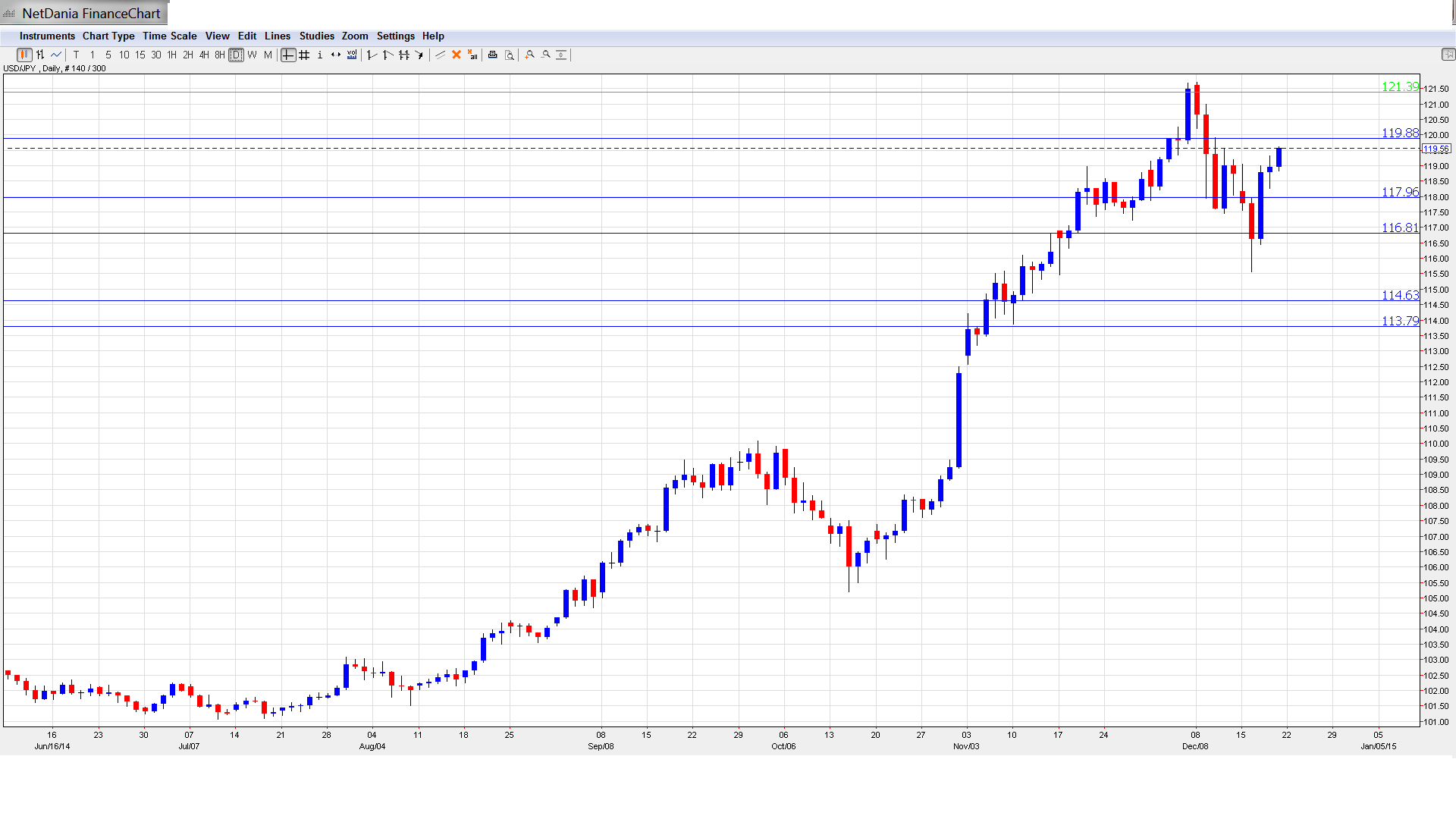 The highlight of the week was the Federal Reserve policy statement. Market analysts noted that previous statements have usually stated that the Fed would maintain low rates for a “considerable time”, but the December statement changed terminology, saying the Fed would be “patient” before raising rates. The statement was followed by a hawkish Yellen, which pushed hard on the yen. Yellen was more clear than the Fed statement, hinting broadly that the Fed could raise rates as early as the second quarter of 2015. In Japan, the BOJ maintained its monetary stance, a policy which has led to a yen trading at multi-year lows against the US dollar.