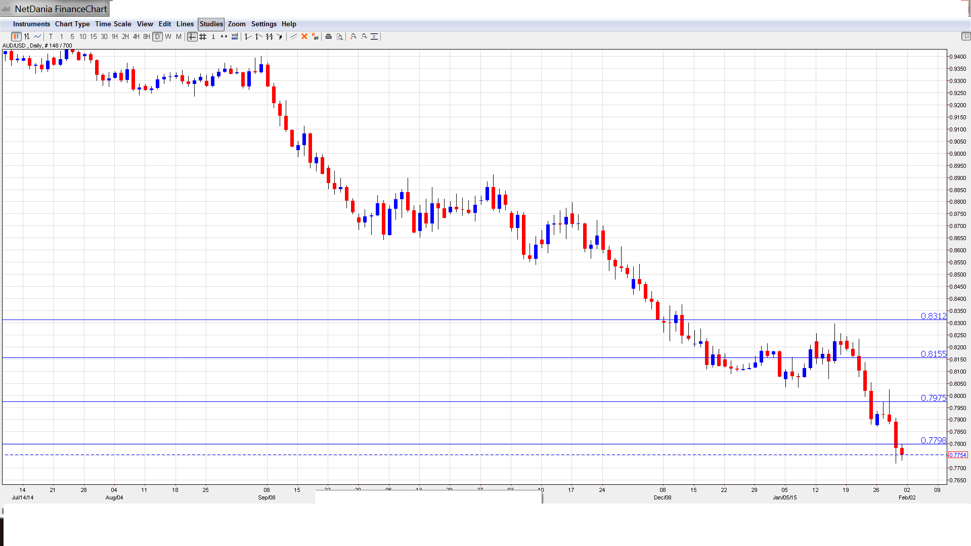 The Australian dollar’s sharp slide continues, as AUD/USD  lost over 100 points last week.  The pair closed at 0.7754,  its lowest level since July 2009. The upcoming week is busy,  with 12  events.  Here is an outlook on the major market-movers and an updated technical analysis for AUD/USD.