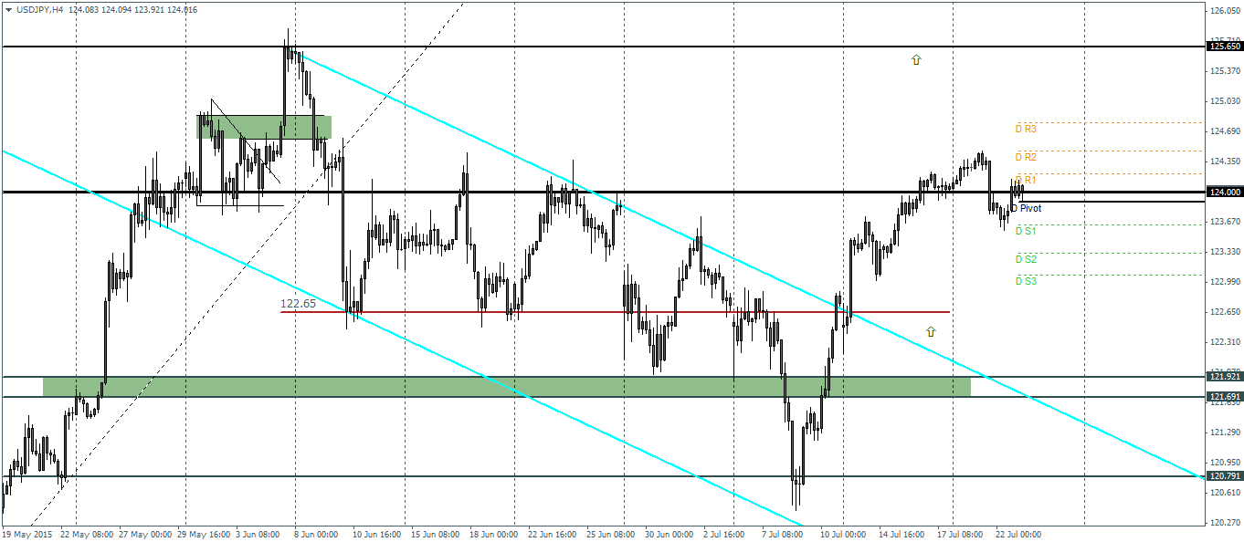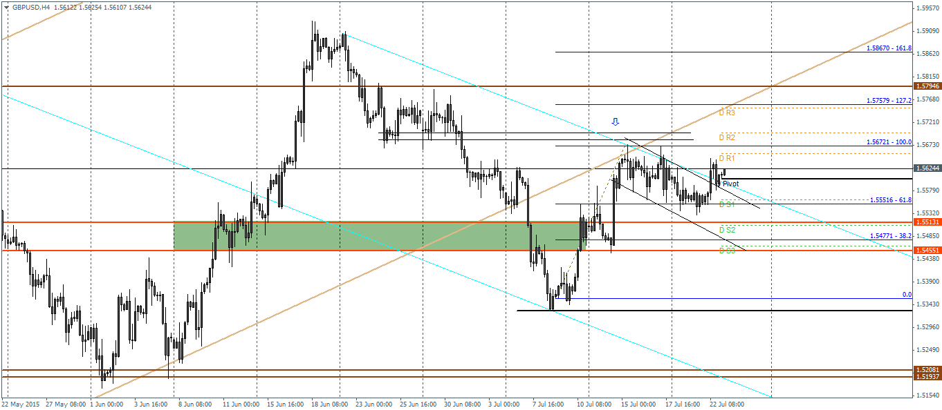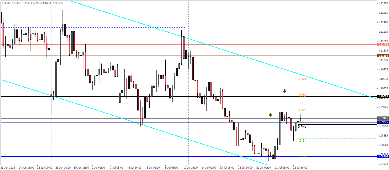 EURUSD (1.093): EURUSD bounced off the support near 1.0825 on Tuesday, 21st July and is yet to test higher to establish resistance. On the intraday charts, the price action reached the first area of resistance trading above 1.09275 and it is possible for another leg higher to test 1.10. There is a potential for EURUSD to form a bull flag pattern, which if stays valid could test as high as up to 1.1053. In either case, we wait for EURUSD to test the 1.10 level of resistance. If the resistance holds, EURUSD could resume its downtrend with 1.09275 and 1.082 being the ideal downside price levels that could be broken. Alternatively, if 1.10 turns to support, EURUSD could potentially break out from the falling price channel, in which case could see a test to 1.113.
