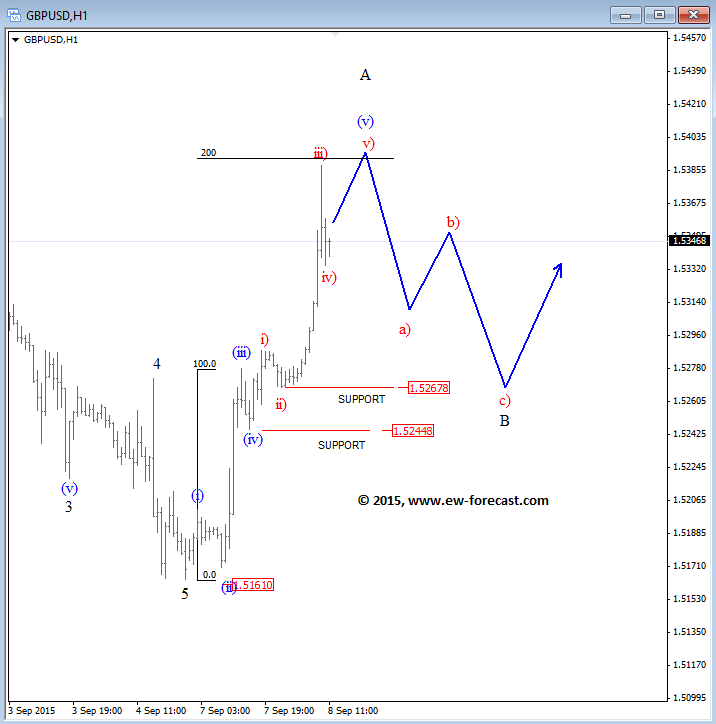 The GBPUSD was up strongly in the last 24 hours, clearly with impulsive structure from the 1.5161 low, so it appears that the bottom is in place. However the shift is temporary, as we track a larger three wave recovery. Currently, we see wave A in final stages, so despite strong upward movement, traders should be aware of a reversal down into wave B corrective pullback. We see technical resistance at 200% Fibonacci extension level that comes in slightly beneath the 1.5400 figure.