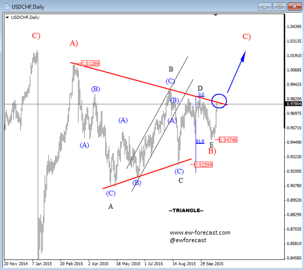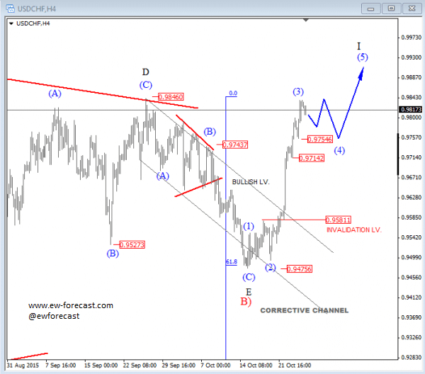 On the 4h chart, USDCHF has finally broken to the upside, emerging from a downward channel, lifting prices up to 0.9740 as expected. We see a current leg as wave (3) of a new bullish impulse so more gains should follow ahead, especially after a wave four pullback which can take place in the next few sessions. Supports are seen at 0.9755 and 0.9715.