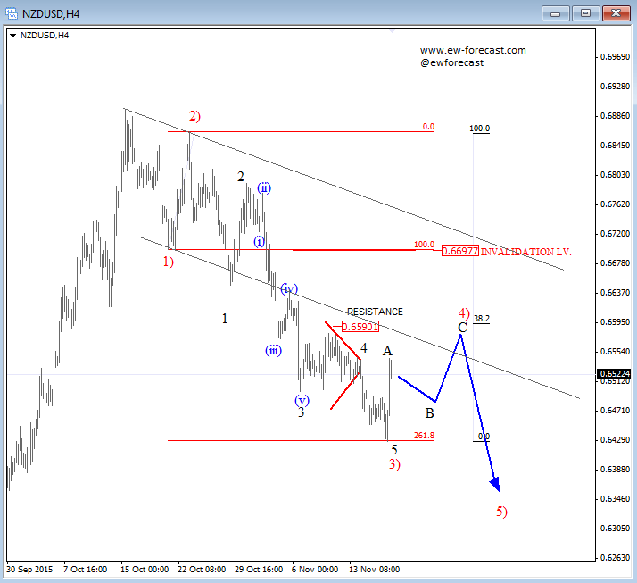 NZDUSD hit 0.6440; near 261.8% from where the price turned up in the last 12 hours. We know that after wave 3) market will make a three wave reversal within wave 4), currently underway up to around 0.6590 from where a downtrend may resume next week.