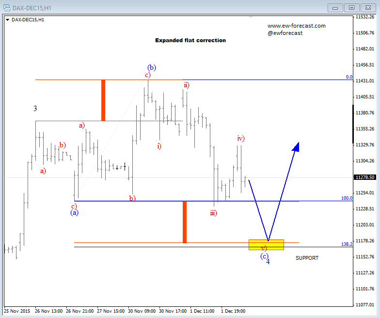 We also see German DAX trading in a corrective wave; possibly making an expanded flat in wave four might be looking for a support around the 11160/11180 region. Ideally, market will bounce from there later today.