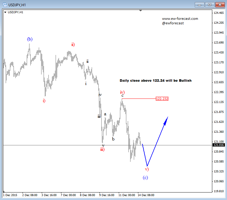 If DAX will bounce, so should USDJPY. On the updated hourly chart we see a five wave decline from December high, which means that a new bounce should occur. It should be made by minimum three waves, but ideally it will be impulsive as the current leg down from 123.67 can be wave (c) of a three wave downward correction. If the bounce will be impulsive, then we could be even considering new lows later this week.